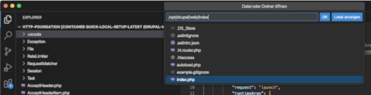 Damit diese Debug Konfiguration im richtigen Ordner angelegt wird, muss in VS Code innerhalb des Dev Containers zuallererst in den Ordner /opt/drupal