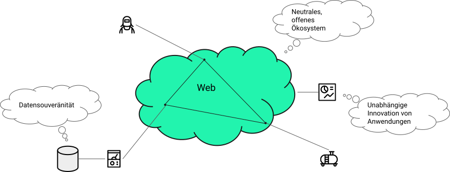 Im Web werden Daten um explizite, einheitliche Konzepte angereichert, um ein gemeinsames Verständnis zu schaffen. Data Owner können ihre Daten denen von Partnerunternehmen und Kund*innen zu einem Knowledge Graph verlinken. Durch die strukturierte Beschreibung von Systemzuständen und -fähigkeiten wird eine plattformunabhängige Zusammenarbeit auf Augenhöhe möglich. Da Interoperabilität auf einem semantischen Level hergestellt wird, verliert die Strukturierung und Organisation von Daten auf der Syntaxebene an Bedeutung. Hierzu können flexible W3C Metaformate wie das Resource Description Framework (RDF) und weitere offene Webstandards und -technologien verwendet werden.