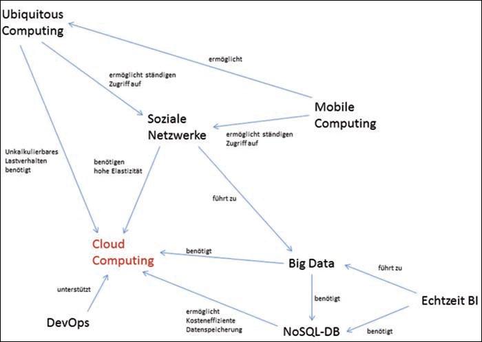 Trotzdem glaube ich, dass alle Unternehmen jetzt anfangen müssen sich mit diesen Themen und den Veränderungen zu beschäftigen. Die IT beschäftigt sich seit Jahren vor allem mit Modernisierungen (und Migrationen) und der Optimierung von Prozessen und Kosten – wir müssen aber wieder der Innovationstreiber für unsere Unternehmen werden. IT ist die Basis für fast alle neuen Geschäftsmodelle der Zukunft. Unternehmen müssen Lean Startup Teams aufsetzen, die sich mit dem Thema Innovation auseinander setzen und beispielsweise herausfinden, wie man Technologien und Ansätze aus dem Big Data Umfeld nutzen kann, um dem Kunden einen besseren Service zu bieten. Beschäftigt man sich mit einem dieser Themen, wird man schnell merken, dass viele dieser neuen Trends miteinander vernetzt sind, was meine Kollegen Uwe Friedrichsen und Dr. Stephan Kepser bereits 2011 aufgezeigt haben: