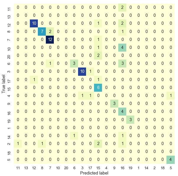 1import matplotlib.pyplot as plt 2import seaborn as sns; 3from sklearn.metrics import classification_report, confusion_matrix 4 5mat = confusion_matrix(y_test, y_pred, labels=cats) 6plt.figure(figsize = (10,7)) 7sns.set(font_scale=1.2) 8sns.heatmap(mat, square=True, annot=True, cbar=False, cmap="YlGnBu",annot_kws={"size": 13}, xticklabels=cats, yticklabels=cats) 9plt.xlabel('Predicted label') 10plt.ylabel('True label') 11plt.show() 12 13print(classification_report(y_test, y_pred, labels=cats))