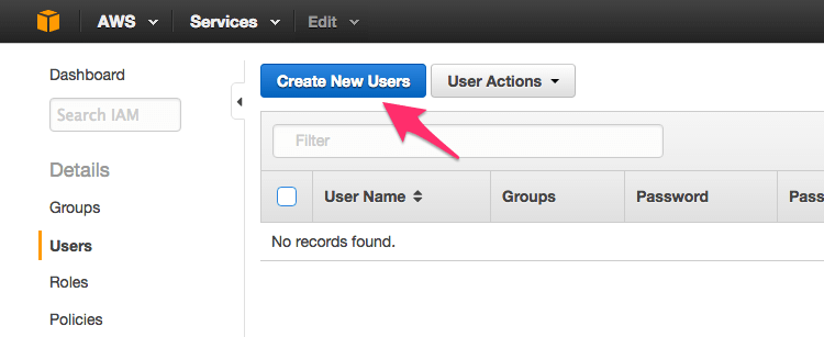 Öffnen Sie wieder den IAM Service und klicken Sie auf „Users“-> „Create New Users/Add User“.