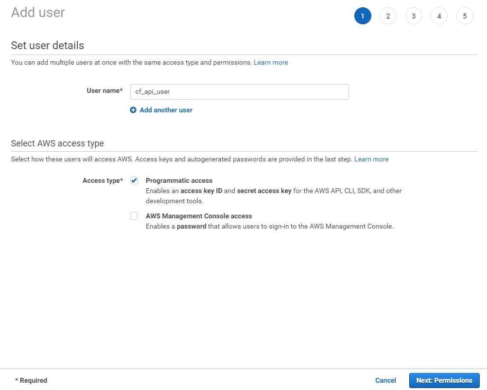 Schritt 1: Benennen Sie den User als „cf_api_user“ und wählen sie „Programmatic access“ aus. Anschließend: „Next: Permissions“