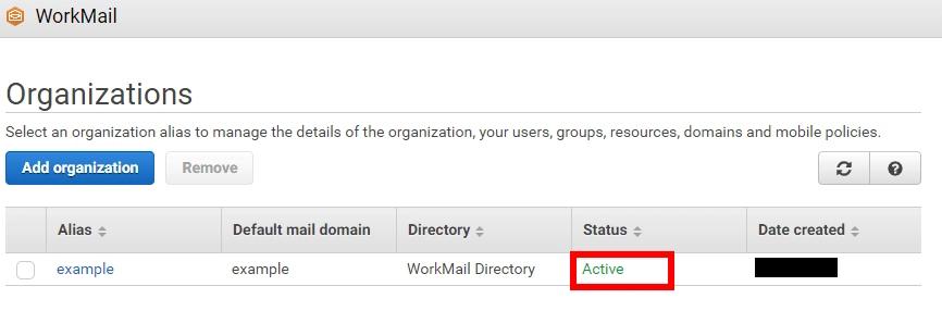 Nach einiger Zeit wird die Bereitstellung des Workmail-Dienstes abgeschlossen.