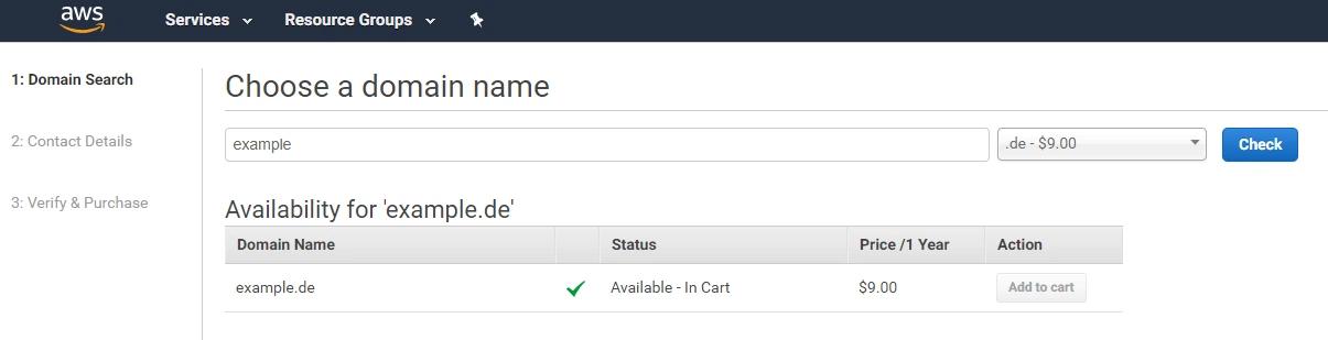 Das ist ein letzter Schritt, den wir in der AWS Konsole durchführen müssen. Die Domain (z. B. „https://example.de“) kann direkt bei AWS gekauft oder nach AWS migriert werden. Für die Migration schauen Sie sich die offizielle AWS Dokumentation an. In diesem Tutorial werden wir einen Bestellvorgang durchführen.