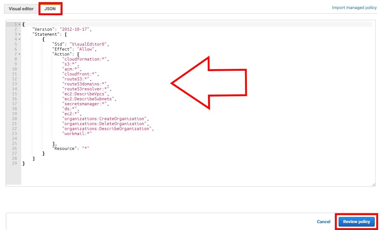 Jetzt auf „JSON“ und fügen Sie danach den kompletten Inhalt der Datei .\aws-hosting\ cf_api_user_rights.txt in das Formular ein. Bestätigen Sie mit „Review policy“.