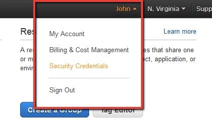 Melden Sie sich mit dem Hauptbenutzer an der AWS-Konsole (https://console.aws.amazon.com/console/home?nc2=h_ct&src=header-signin ) an und klicken Sie im oberen rechten Bereich auf Ihren Benutzernamen und dann auf „Security Credentials“.