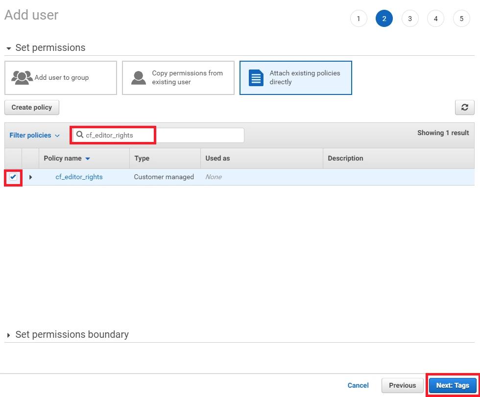 Schritt 2: Wählen Sie „Attach existing policies directly“. Suchen Sie nach „cf_editor_rights“ und setzen Sie Häkchen bei der gefundenen Policy. Dann auf „Next:Tags“