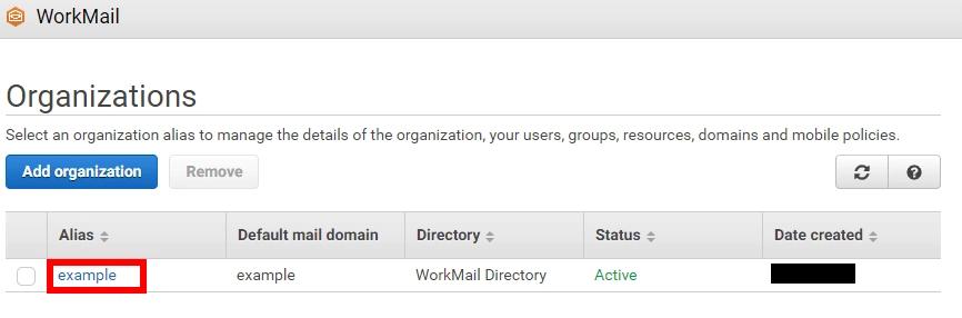 Jetzt müssen Sie noch Ihre Domain-Adresse mit dem Service Workmail verknüpfen. Dafür klicken Sie auf den erstellten Alias, z. B. „example“…