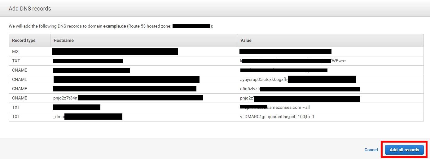 Und noch die automatisierte Erweiterung der DNS-Tabellen seitens AWS mit „Add all records“ bestätigen.
