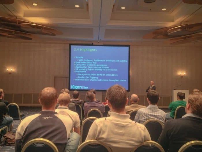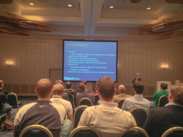 Die eintägige Konferenz im Hilton Park Hotel drehte sich natürlich voll und ganz um MongoDB in all seinen Facetten. Dabei war das Programm ein guter Mix aus Vorträgen von 10gen Ingenieuren sowie von Vorträgen aus der mittlerweile doch sehr großen deutschen Benutzergemeinde. So verwundert es auch nicht, dass die Konferenz mit über 200 Besuchern für eine Herstellerkonferenz erstaunlich gut besucht war. Und wie verschiedene Umfragen während der Vorträge zeigten, setzen viele dieser Besucher MongoDB auch bereits produktiv ein. Dabei ist die Datengröße dieser Installationen meist noch im unteren Gigabyte-Bereich, lediglich wenige Anwender setzen schon Datenbanken im Petabyte-Bereich ein.
