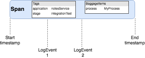 Ein Span besitzt einen frei wählbaren Namen, der die Operation oder den Prozessschritt beschreibt sowie einen Start- und einem Endzeitpunkt. Darüber hinaus lässt er sich mit Tags, die als Key-Value-Paar aufgebaut sind, anreichern. Diese gelten nur für diesen einen Span, aber über die gesamte Verarbeitungszeit. LogEvents lassen sich ebenfalls für einen Span erstellen. Anders als Tags gelten diese aber nur für einen bestimmten Zeitpunkt innerhalb des Ausführungszeitraumes des Spans. Prozess- und Systemgrenzen übergreifend lassen sich sogenannte BaggageItems nutzen. Auch hierbei handelt es sich um einfache Key-Value-Paare.