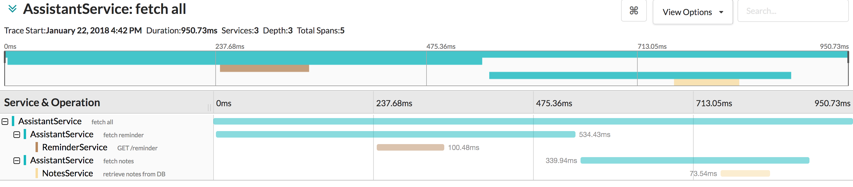 Als nächstes rufen wir die jeweiligen Services. Für jeden Aufruf erstellen wir einen eignen Span. Das geschieht analog zu dem obigen Beispiel, jedoch mit einem Unterschied: Wir setzen noch via asChildOf() den Parent-Span.