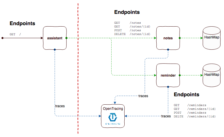 Es gibt einen Service assistant, der dem Aufrufer sowohl Notizen als auch Erinnerungen zurückgeben soll. Beide erhält der assistant Service aus jeweils einem eigenen Service (note und reminder). Der Client wird also bei der Anfrage des REST-Endpunktes vom assistant Service einen neuen Span erzeugen. Dieser Span wird für uns transparent über das Tracer-Objekt mit all seinen Daten an den Tracer-Server (in diesem Fall jaeger von uber) übertragen. Dies geschieht unabhängig von unserem Request. Hierfür gibt es bei jaeger intern eine Queue, die eigenständig abgearbeitet wird. Die HTTP-Aufrufe an die nachgelagerten Services erhalten Header-Parameter, die notwendig sind, um Spans einem bestimmten Trace zuzuordnen und BaggeItems zwischen zwei Spans übertragen zu können. Letztere nur, sofern diese auch gesetzt wurden. Die Header-Parameter sind das Ergebnis der jeweiligen Implementierung der inject() und extract() Methoden. Ihre Ausprägung ist damit anbieterspezifisch. Bei jaeger sehen diese Header wie folgt aus: