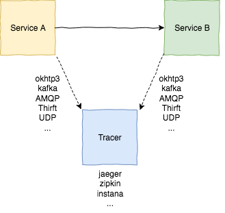 Wie das Reporting vom Service an den Tracer-Server genau stattfindet ist abhängig von der jeweiligen Implementierung und dem gewählten Reporter. Jaeger ist beispielsweise ein Tracer, den man als OpenTracing-Implementierung nutzen kann. Als Reporter bietet Jaeger unter anderem http, thrift oder auch UDP an.