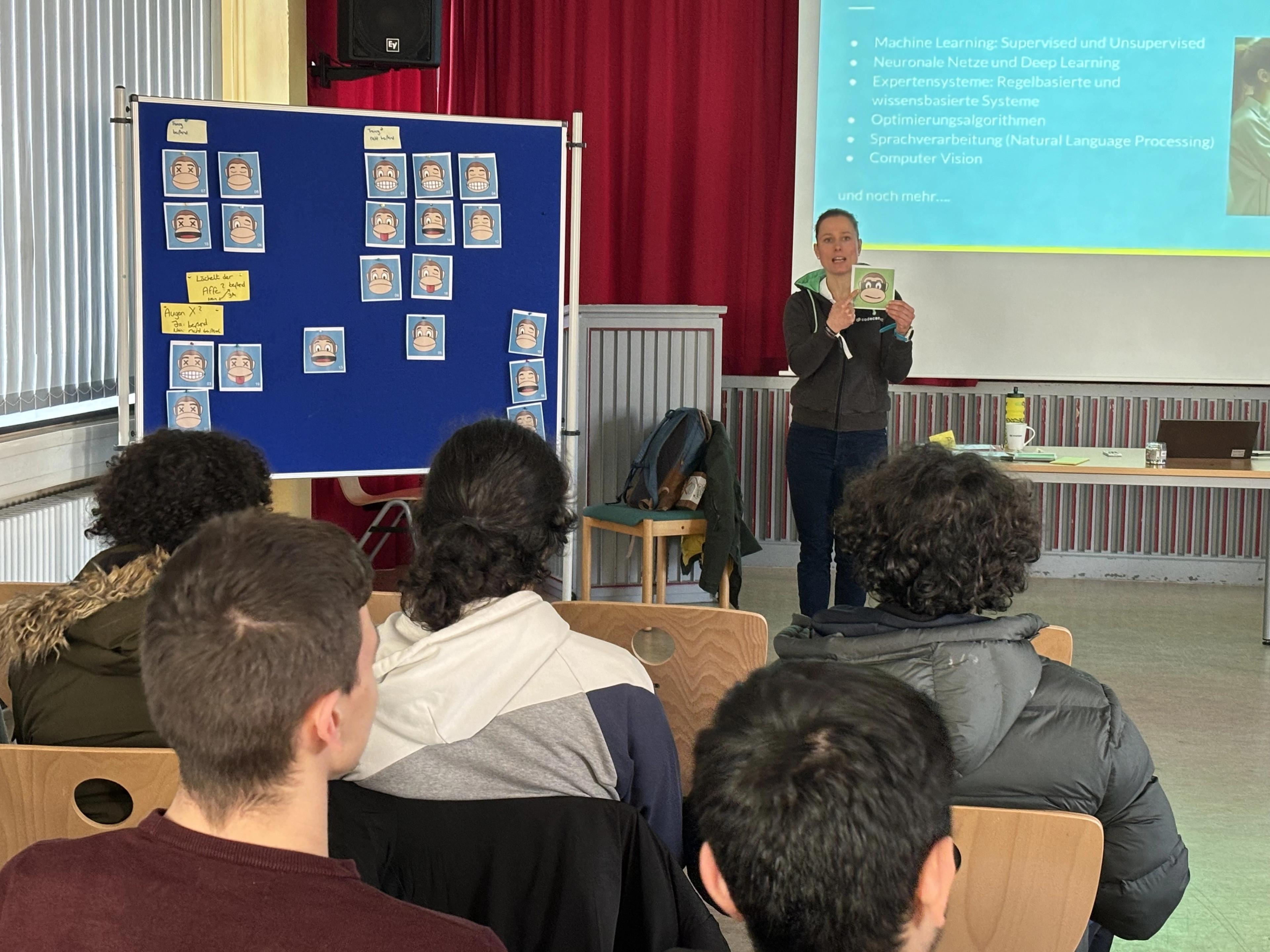 Im Januar 2024 habe ich daher einmal eine andere Rolle eingenommen und war nicht als IT Consultant unterwegs, sondern stand vor einer 12. Klasse des beruflichen Gymnasiums mit Schwerpunkt Betriebsinformatik am Berufskolleg Werther Brücke in Wuppertal. In einem zweistündigen Workshop habe ich ein Grundverständnis für künstliche Intelligenz vermittelt. Schülerinnen und Schülern sollten verstehen, in welchen Bereichen KI Mehrwerte stiften kann, aber auch Risiken verstehen. Die Klasse kannte bereits Algorithmen und hatte den Begriff Machine Learning kennengelernt, doch es fehlte ihr der Zusammenhang und auch die Unterscheidung zwischen den drei Begriffen Algorithmus, Machine Learning und künstliche Intelligenz.