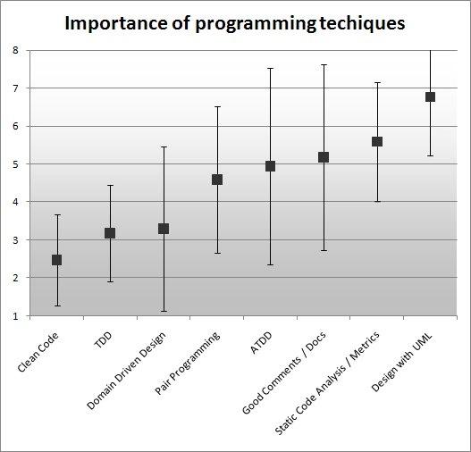 Hier sollten die Teilnehmer verschiedene Techniken der Softwareentwicklung priorisieren. Das Diagramm gibt die gemittelte Platzierung und die Varianz der Ergebnisse an. Das Ergebnis ist meiner Meinung nach sehr interessant. Noch vor TDD landet „Clean Code „. Dann kommt TDD, dicht gefolgt von Domain Driven Design. Wer hätte das gedacht?