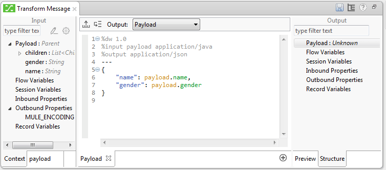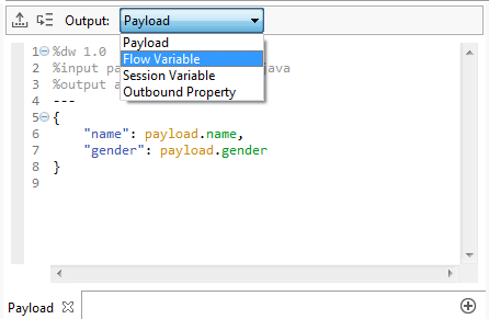 Die beiden Bilder oben zeigen noch zwei andere Features von DataWeave, allerdings nicht auf den ersten Blick: Über dem Editor lässt sich einstellen, wo das Ergebnis der Transformation gespeichert werden soll: