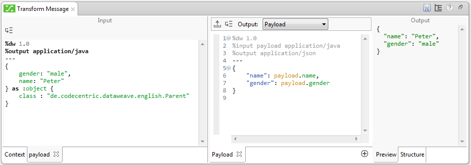 Was passiert darin? Aus einem POJO werden zwei Attribute (name, gender) in ein Json-Objekt transformiert. Die dazu notwendige Meta-Information steht direkt unter der Versionsnummer von DataWeave.