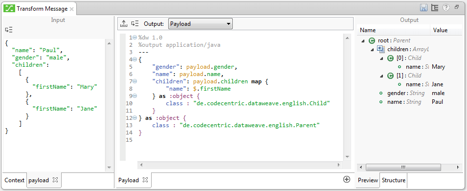 Links stehen die Metadaten der ankommenden Mule-Message, rechts die der transformierten Message. In der Mitte wird die DWL-Datei editiert. Interessant wird es, wenn man unten auf „payload“ und „Preview“ umschaltet. Links stehen eingehende Beispieldaten (die man jederzeit editieren darf), rechts zeigt Anypoint das Ergebnis der Transformation direkt an. Bei XML-, Json- und CSV-Daten sieht man die Daten in der jeweiligen Syntax, bei Java-Klassen (wie im Beispiel links für die Eingabedaten zu sehen) wird der Inhalt als Json dargestellt: