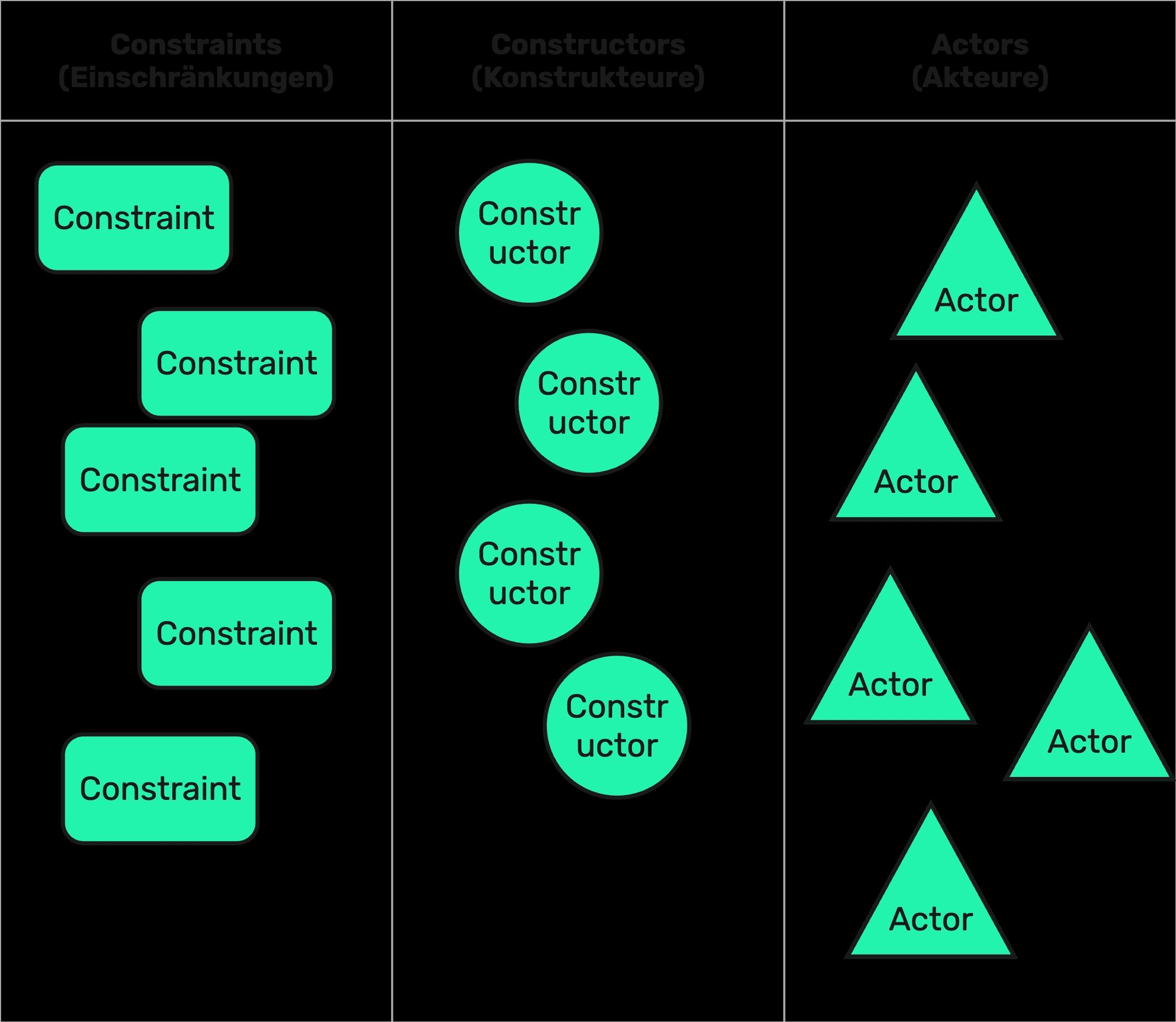 - Actors (Akteure): Individuen oder Gruppen, die im System handeln und es beeinflussen, aber im Gegensatz zu Konstruktoren keine aktiv gestaltende Rolle einnehmen, z.B. Kunden, Bürger oder Mitarbeiter.