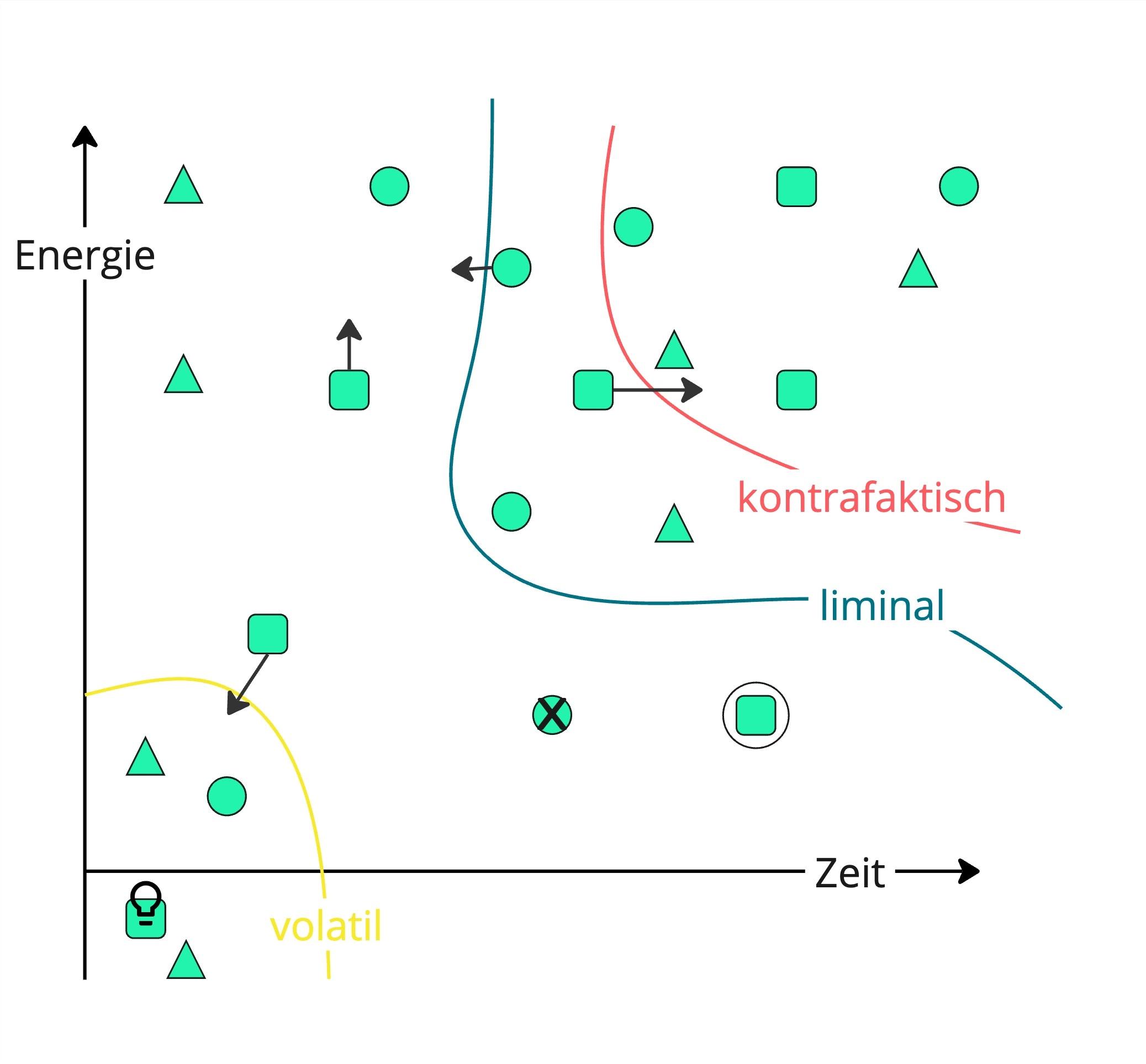- Der Bereich um den Koordinatenursprung wird durch die volatile Linie gekennzeichnet. Dieser Bereich kennzeichnet nicht wie in anderen Modellen low hanging fruits sondern beschreibt volatile Elemente. Die Aktanten in diesem Bereich benötigen minimalen Energie und Zeitinput um sich zu verändern. Diese Elemente sollten gesondert beobachtet werden, da sie sich jederzeit ändern können. Bei Manchen mag das akzeptabel oder erwünscht sein. Andere bieten einen guten Ansatzpunkt, sie über Mikro-Aktionen in Form von safe-to-fail Experimenten in einen Zustand mit höherem Energie- und/oder Zeitaufwand zu überführen oder durch ein Monitoring im Blick zu behalten.
