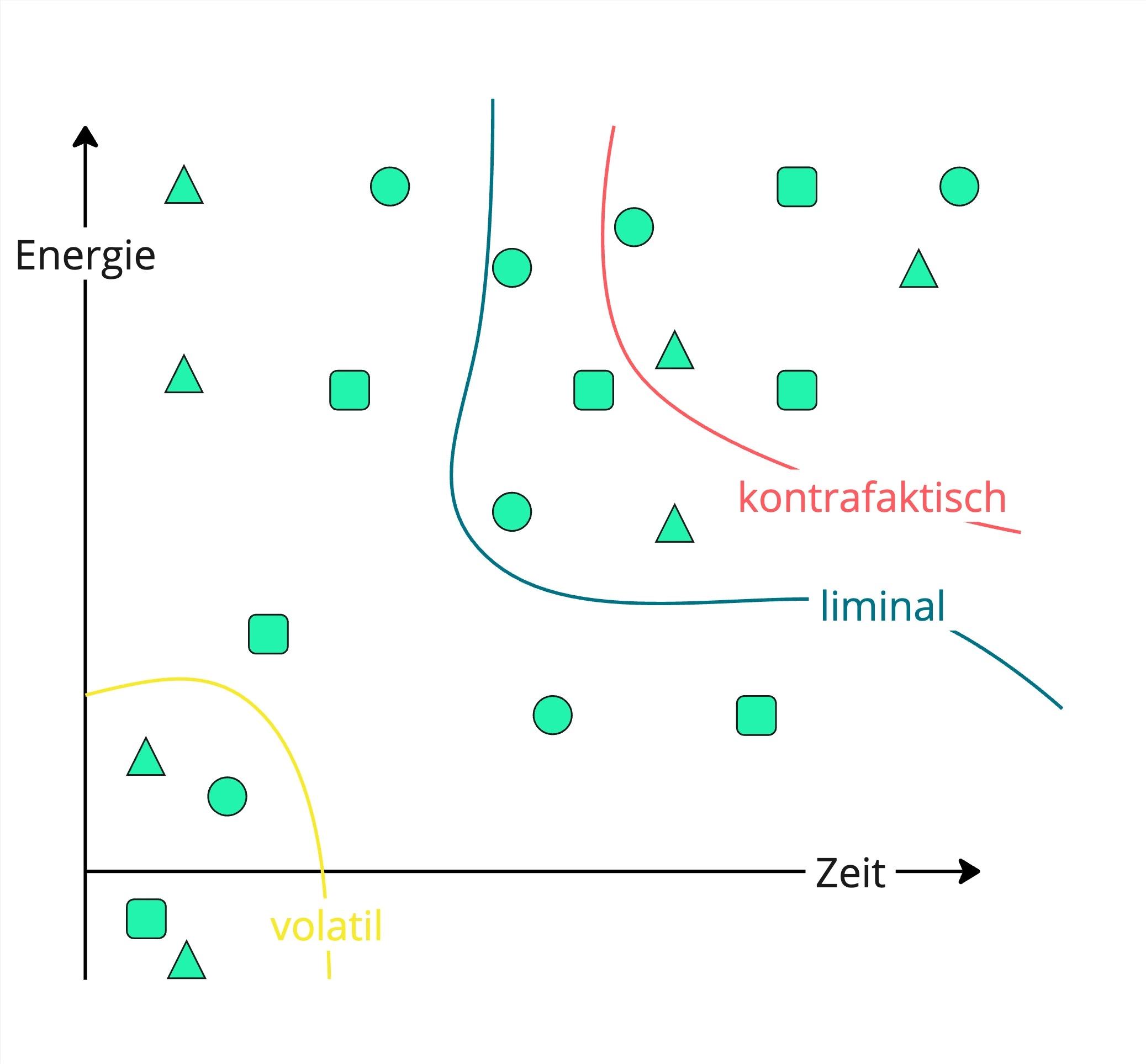 Die erstellte Liste der Aktanten dient als Input für die eigentliche “Landkarte”. Diese besteht aus einem Koordinatensystem mit “Energie” auf der y-Achse und “Zeit” auf der x-Achse. Die Energie-Achse kann hierbei auch negativ werden im Gegensatz zur Zeit-Achse.