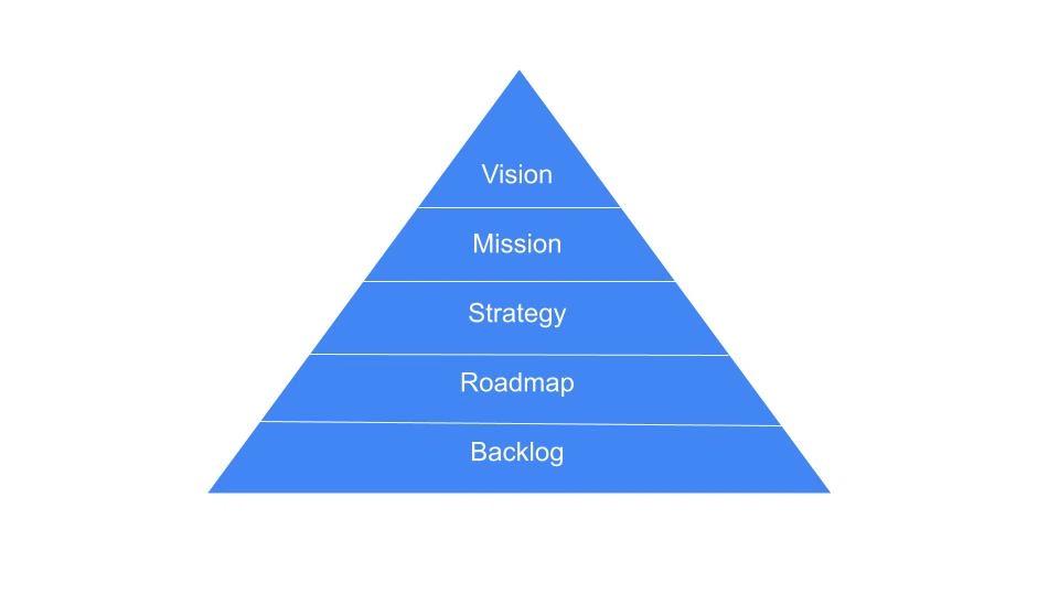 Es gibt unzählige Methoden zur Entwicklung einer Strategie, jede mit ihren eigenen Nuancen. Um nur einige zu nennen: Product Vision Board, Product Strategy Canvas, OKR-Pyramide oder strategisches Managementsystem. Fast alle basieren jedoch auf dem Glauben, dass die Produktverantwortlichen einer Kaskade von Schritten folgen sollten, die oft als Pyramide, Stack oder überlappende Kreise visualisiert werden. Die Vision steht oben, manchmal gefolgt von einer Mission, und die Strategie befindet sich in der Mitte und ist mit den unteren Komponenten verbunden: der Roadmap und dem Backlog. Dieses Konzept geht auf die Arbeit von Peter Drucker zurück, dem ersten zeitgenössischen Managementtheoretiker. Er legte 1962 den Grundstein für das Verständnis von Strategie als zielgerichtete Aktivität, die eng mit langfristiger Planung verbunden ist. Bis heute wird dieses Konzept in zahlreichen Canvases fortgeführt, bei denen erwartet wird, dass du die Vision ausfüllst und die Strategie magisch ableitest.