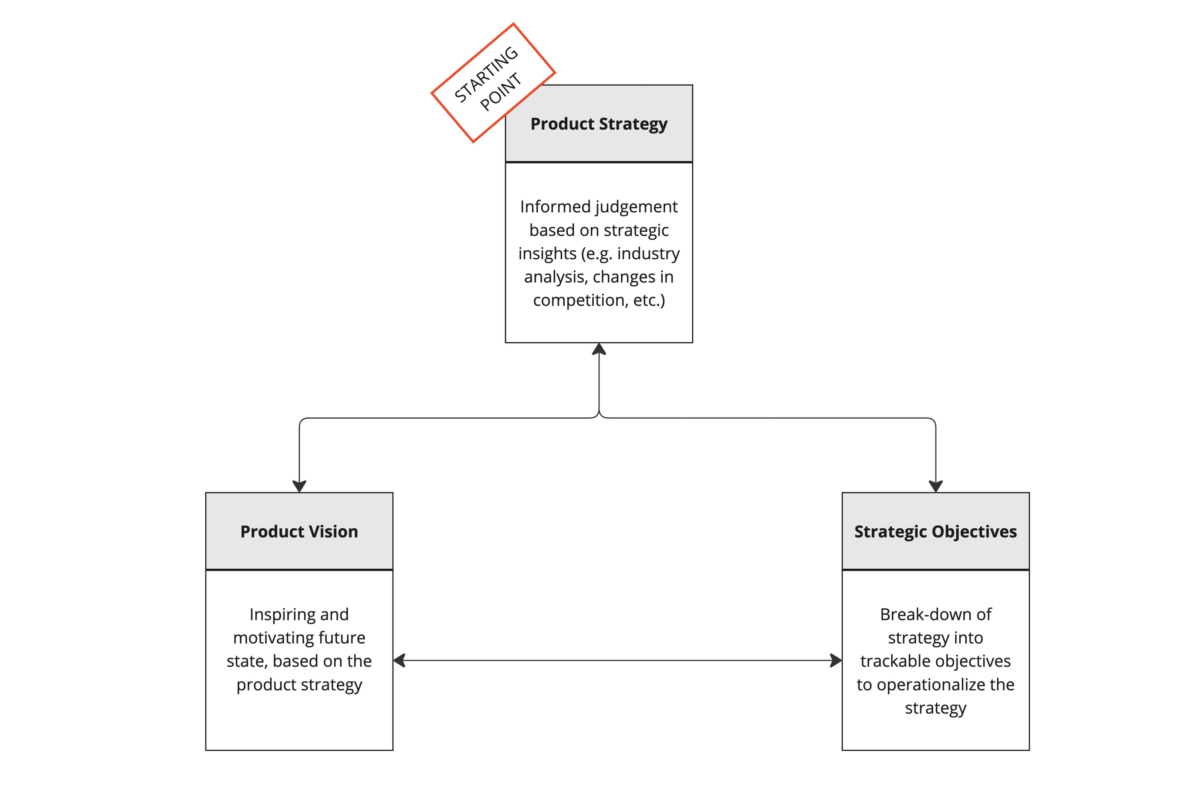 Ich kann das nachvollziehen und du bist nicht allein. Viele Produktverantwortliche stehen vor der Herausforderung, ihre Produktstrategie zu formulieren. Ich habe diese Situation oft sowohl in Inhouse-Positionen als auch bei Kunden erlebt. Die Daten unterstützen dies ebenfalls: „25,3 % der Produktmanager geben an, dass die Unternehmensstrategie nicht sehr klar oder überhaupt nicht klar ist.“ (Roadmap.com ). Was erschwerend hinzukommt: Wie Marty Cagan in seinem Buch Empowered feststellt, „haben erstaunlicherweise die meisten Produktorganisationen keine Produktstrategie“. Einer der Gründe für Mängel in der Produktstrategie oder ein völliges Fehlen derselben ist der weit verbreitete Glaube unter Produktmanagern, dass sie mit der Produktvision starten und dann ihre Strategie ableiten müssten. Tatsächlich ist eine inspirierende Vision jedoch das Ergebnis der Strategie, nicht ihr Ausgangspunkt.