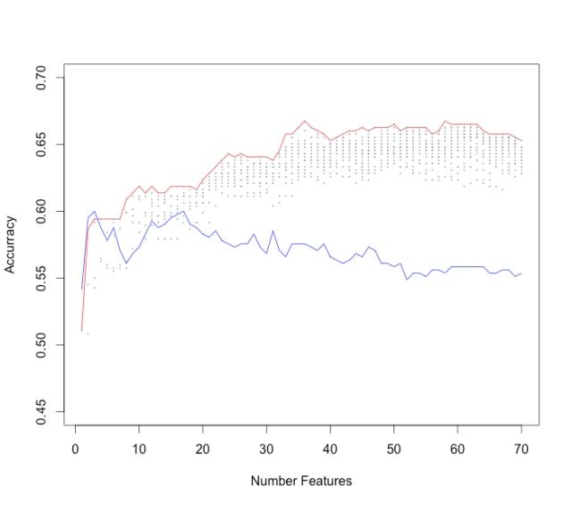 Dargestellt ist die Genauigkeit (Anteil der Korrekt vorhergesagten Klassen) für die jeweils besten Modelle mit 1..71 Features (die Buchmacherquoten habe ich hier nicht mit verwendet). Die rote Linie zeigt die Leistung auf den Trainingsdaten (wie zu erwarten nimmt diese im großen und ganzen mit der Anzahl der Features zu), die grauen Punkte jeweils die Genauigkeit aller in einem Schritt betrachteten Modell. Die blaue Linie zeigt die Leistung auf den Testdaten – hier sieht man, dass das die maximale Genauigkeit eigentlich schon mit den richtigen 3 Features erreicht wird. Das Modell mit 3 Features wäre dann wohl auch das was man verwenden würde (oder sogar das mit 2, da der Unterschied zwischen diesen nicht statistisch signifikant ist und man in so einem Fall das einfachere Modell bevorzugen sollte).