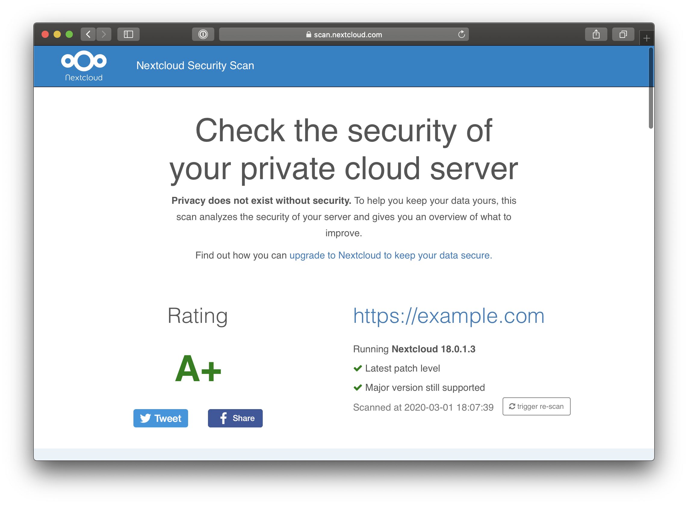 Ein nicht zu unterschätzender Aspekt beim eigenständigen Verwalten einer Cloud-Instanz ist die Konfiguration der Software und des darunterliegenden Betriebssystems. Natürlich ist darauf zu achten, dass sowohl die NextCloud-Installation als auch das Betriebssystem selbst stets aktuell gehalten werden, um möglichen Angriffen aus dem Weg zu gehen. Dies ist Dank des eingebauten Updaters sehr einfach möglich, muss jedoch in regelmäßigen Abständen selbstständig kontrolliert werden. Zudem bieten die Entwickler von NextCloud auch ein Security-Scan-Tool an, welches die Instanz von außen überprüfen kann. Natürlich ist es nicht sinnvoll, sich blind auf diese Angaben zu verlassen, da sie nur Anhaltspunkte für mögliche Schwachstellen offenbaren.