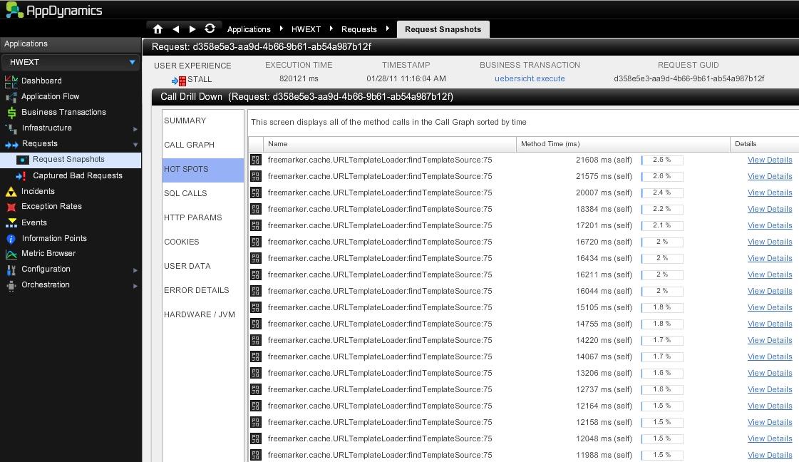 Bei der Durchführung von Lasttests auf einem Projekt bemerkte ich einen spontanen Abfall der Antwortzeiten. Je mehr Benutzer auf die Anwendung zugriffen, desto langsamer wurde sie. Die Anwendung wurde mit dem Struts 2 Java Framework erstellt und griff auf die Datenbank über Hibernate zu. Eigentlich eine ganz simple Anwendung, umso verwunderlicher waren für mich die schlechten Ergebnisse. Nach dem Studium der von AppDynamics aufgezeichneten Messwerte wurde mir aber schnell klar, dass es sich um ein Problem mit Freemarker, der in Struts2 nutzbaren Template Engine, handeln musste: