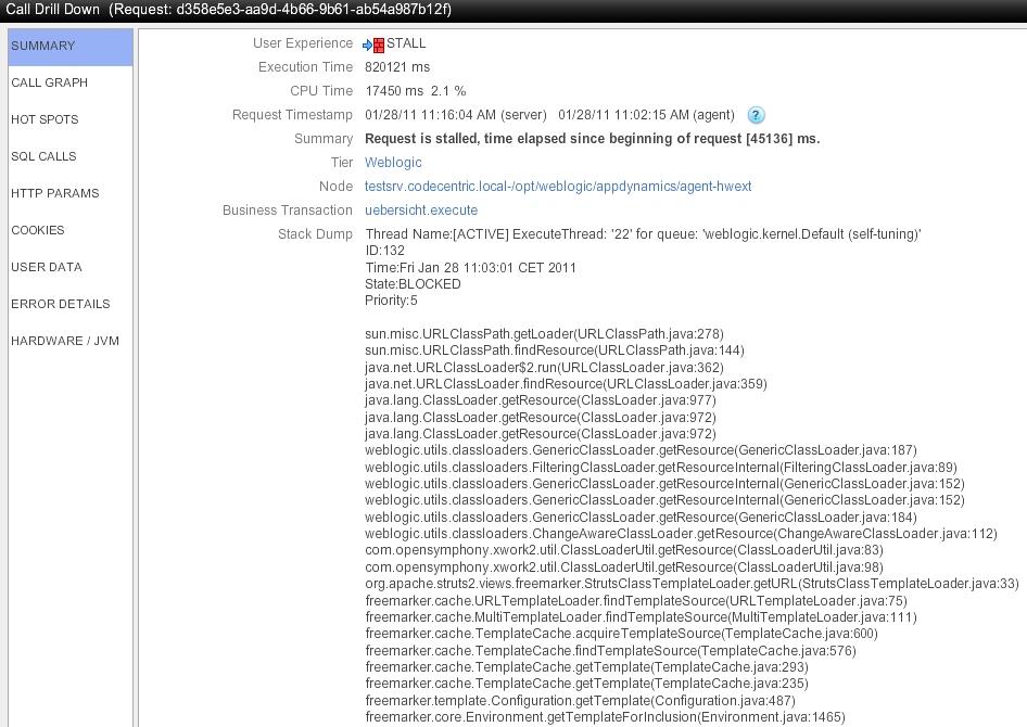 Also, was verursacht diese langen Wartezeiten? AppDynamics hat dankenswerterweise automatisch einige Threaddumps für uns gezogen, welche alle auf die blockierten Threads in sun.misc.URLClassPath.getLoader() hinweisen.