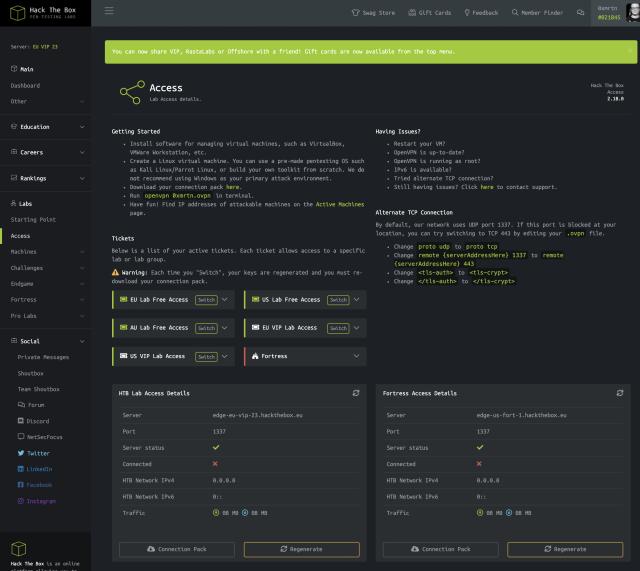 Vorerst konzentrieren wir uns auf die Maschinen – dies sind virtuelle Maschinen, die in einem Virtual Private Network (VPN) laufen. Um auf dieses VPN zuzugreifen, musst du auf die Zugangsseite navigieren.