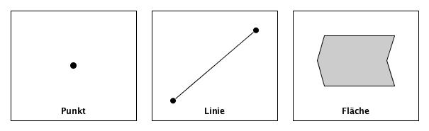 Die räumliche Lage wird in der Regel mit einer Koordinate aus Längen- und Breitengrad angegeben. Die grundlegenden geometrischen Formen, die man bei der Modellieriung verwendet, sind ein Punkt, eine Linie und eine Fläche, die in ihrer einfachsten Form durch ein Polygon abgebildet wird.