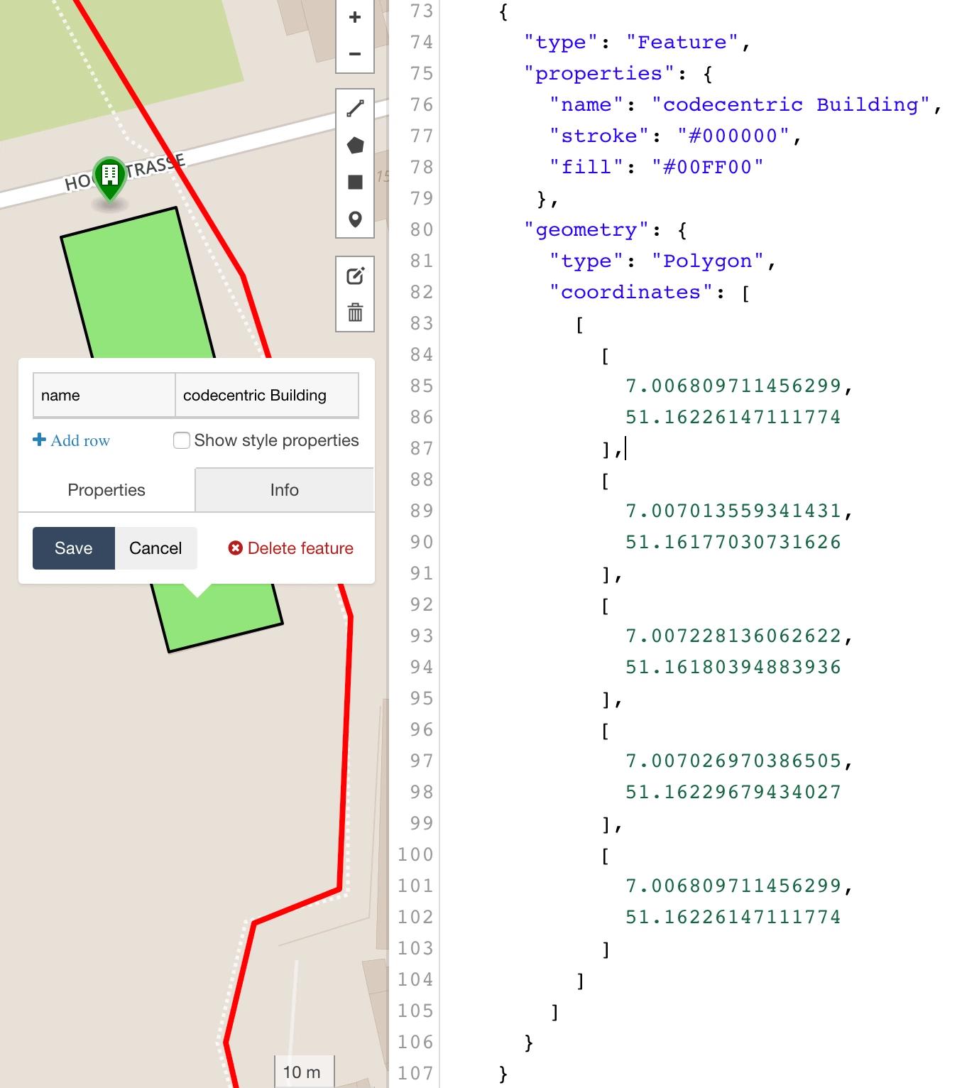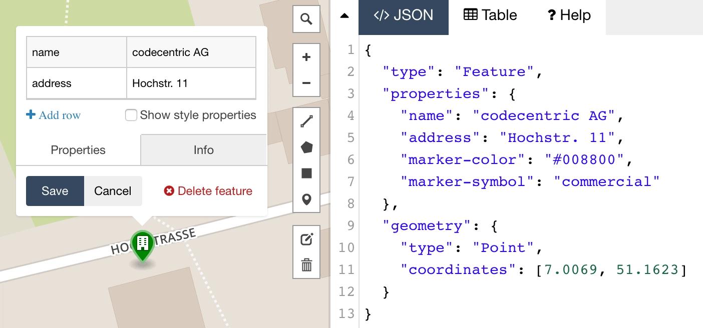 1{ 2 "type": "FeatureCollection", 3 "features": [ 4 { 5 "type": "Feature", 6 "properties": { 7 "name": "codecentric AG", 8 "address": "Hochstr. 11", 9 "marker-color": "#008800", 10 "marker-symbol": "commercial" 11 }, 12 "geometry": { 13 "type": "Point", 14 "coordinates": [7.0069, 51.1623] 15 } 16 } 17] 18}