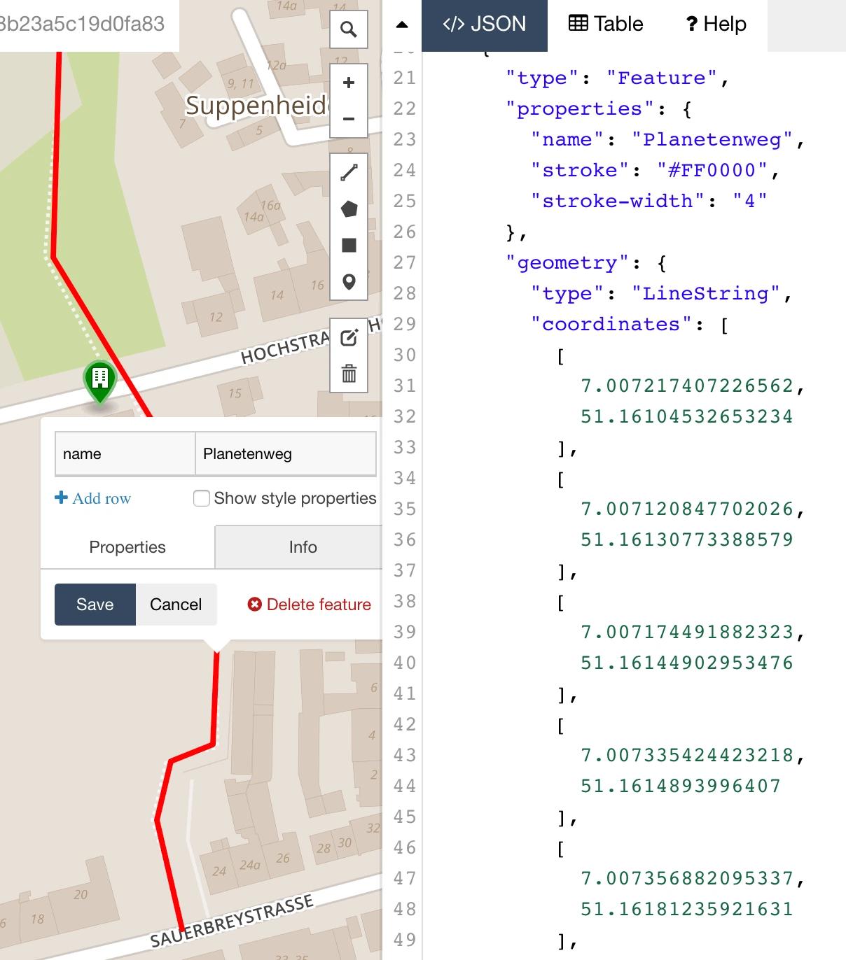 Das Beispiel visualisiert den Planetenweg in Solingen-Ohligs. Bei einem LineString besteht das Attribut coordinates aus einer Liste mit mindestens zwei Punkten. Farbe und Strichstärke lassen sich über entsprechende Properties anpassen.