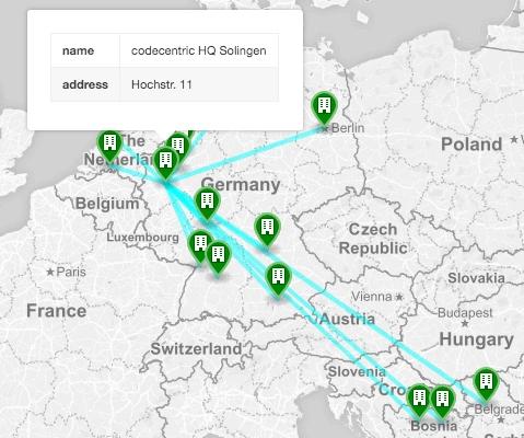 Als Beispiel dient hier ein Karte, auf der das Hauptquartier der codecentric AG in Solingen mit allen Niederlassungen verbunden ist. Die Verbindungen sind mit einem MultiLineString realisiert:
