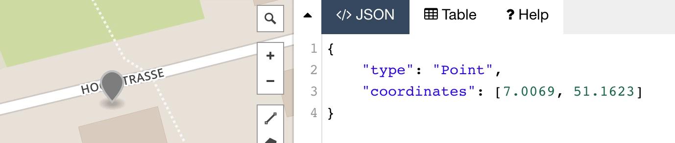 1{ 2 "type": "Point", 3 "coordinates": [7.0069, 51.1623] 4}