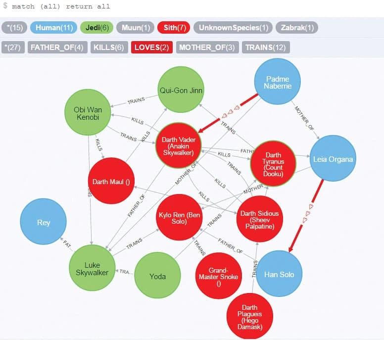Per Default werden die Knoten mit Label Human grün dargestellt, die mit Jedi blau. Da es aber z. B. mehr Knoten mit Label Human als Jedi gibt, werden auch die menschlichen Jedi grün eingefärbt. Außerdem gefällt den Sith natürlich das Plüschrosa als Erkennungsfarbe nicht. Das alles lässt sich aber individuell anpassen.
