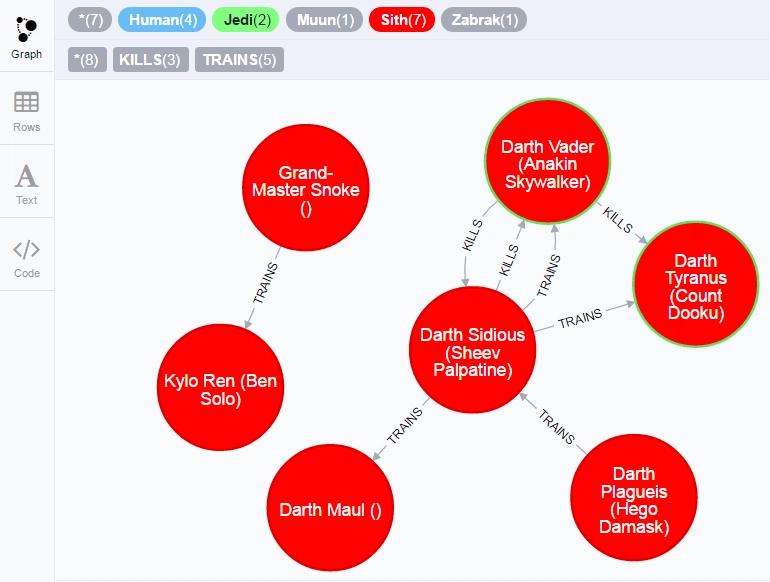 1CREATE 2// Jedi ... 3(yoda :Jedi :UnknownSpecies {name:"Yoda"}), 4(dooku :Jedi :Sith :Human {name: "Count Dooku", sith_name: "Darth Tyranus"}), 5(qui_gon :Jedi :Human {name: "Qui-Gon Jinn"}), 6(obi_wan :Jedi :Human {name: "Obi Wan Kenobi"}), 7...
