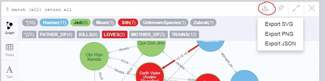 Zunächst einmal bietet der Neo4j-Browser bereits an, einige Datei-Formate zu exportieren, namentlich sind das SVG, PNG und JSON: