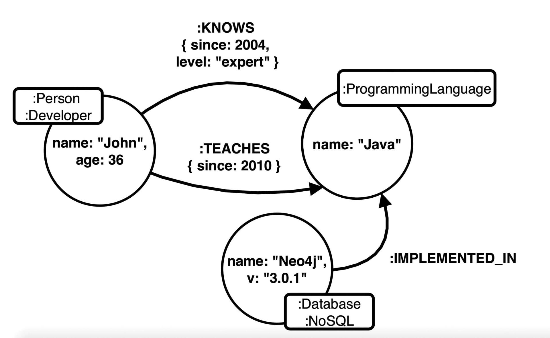 1$ CREATE (john :Person :Developer {name: "John", age: 36}), 2(java :ProgrammingLanguage {name: "Java"} ), 3(john) -[:KNOWS {since: 2004, level: "expert"} 4]->(java); 5+-------------------+ 6| No data returned. | 7+-------------------+ 8Nodes created: 2 9Relationships created: 1 10Properties set: 5 11Labels added: 3 12105 ms