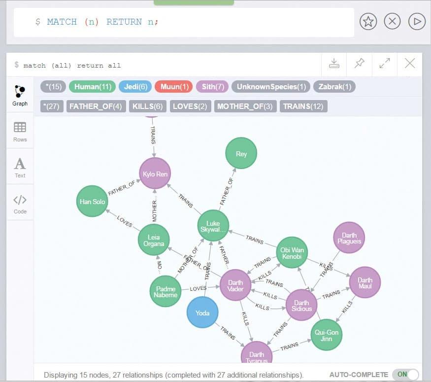 Im oberen Bereich der Graphen-Darstellung (daneben gibt es auch noch eine tabellarische, textuelle und eine für die API-Ebene) listet der Neo4j Browser die Labels aller gefundenen Knoten samt der jeweiligen Vorkommen auf. Von insgesamt 15 Knoten haben z. B. 7 das Label Sith. Darunter befindet sich die Zusammenfassung aller gefundenen Kanten, die per Default alle in grau dargestellt werden. Die Label mit den häufigsten Vorkommen erhalten automatisch gut unterscheidbare Farben zugewiesen, ebenso wird ein Attribut der Knoten und Kanten zur Beschriftung herangezogen. Beim Mouseover über einen Knoten erfolgt ganz unten eine Auflistung aller Label und Attribute. Der gesamte Bereich kann noch expandiert werden; in der dann erscheinenden Ansicht kann man u.a. auch noch in den Graphen zoomen.