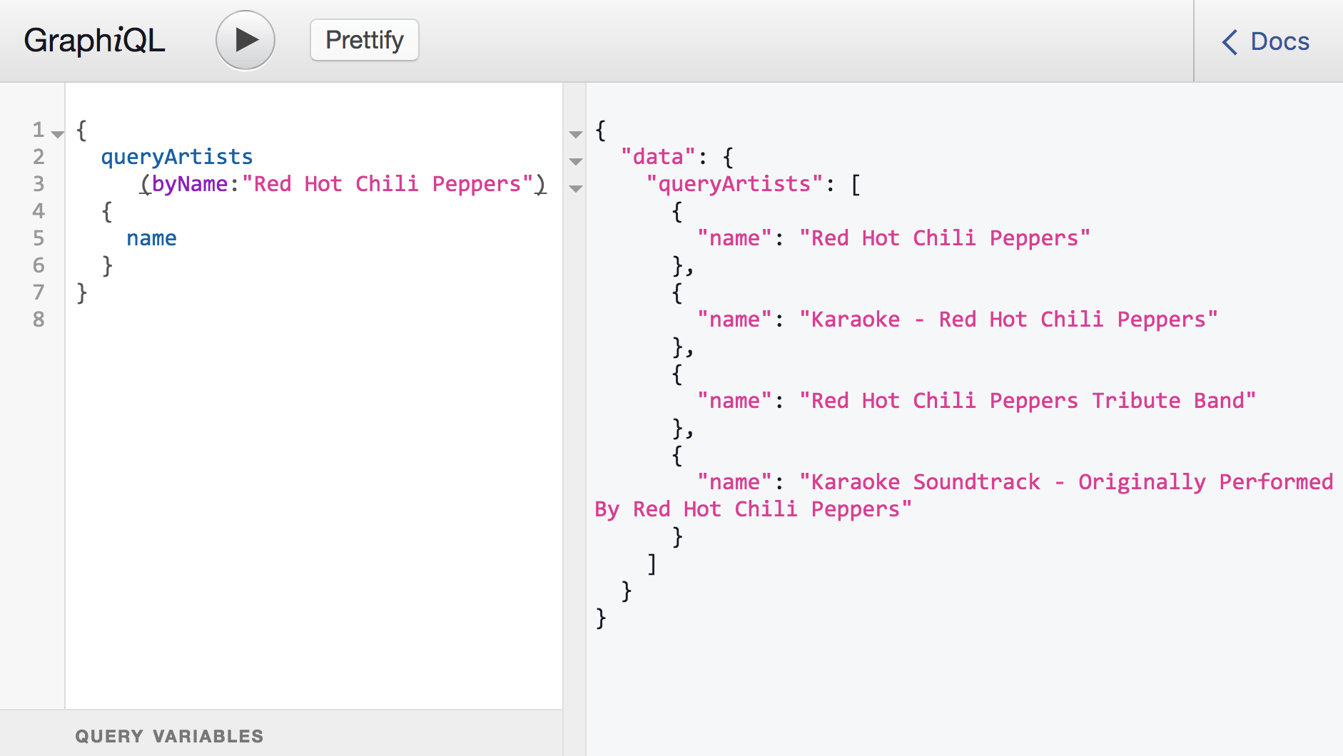 Wir haben unseren eigenen GraphQL-Server erstellt, der uns grundlegende Informationen vom Spotify-API-Server lädt. Jetzt können wir mit dem Laden der Daten zu einem Künstler in Graphiql beginnen: Beim Aufruf über direktem Link von unserem lokalen Server http://localhost:4000/graphql?query=%7B%0A%20%20queryArtists%20%0A%20%20%20%20%20(byName%3A%22Red%20Hot%20Chili%20Peppers%22)%20%0A%20%20%7B%0A%20%20%20%20name%0A%20%20%7D%0A%7D%0A oder von der Live Demo https://spotify-graphql-server.herokuapp.com/graphql?query=…. erhalten wir: