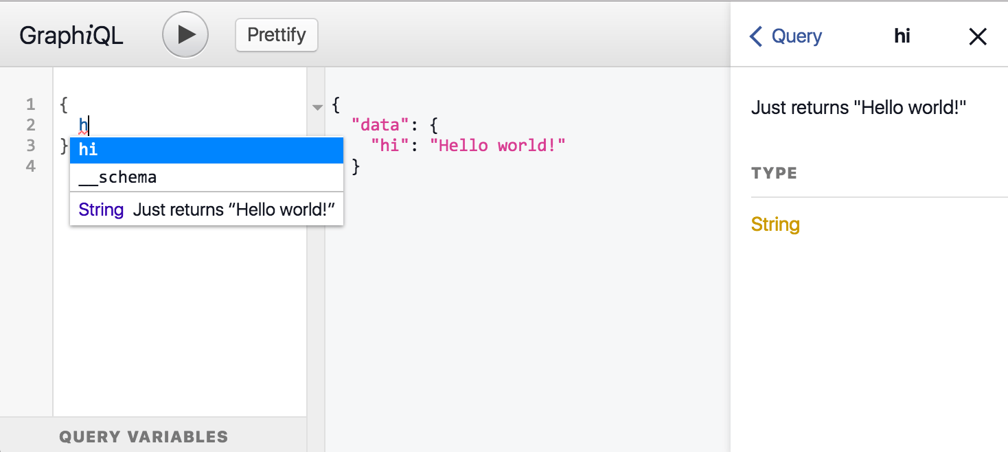 In der folgenden, stark vereinfachten Beispielimplementierung, hat der query type gerade nur das Feld hi, das immer den Wert hello world besitzt. Es ist also die Verbindung zu einem Datenknoten „Hello World“, der über die Kante „hi“ erreicht werden kann.