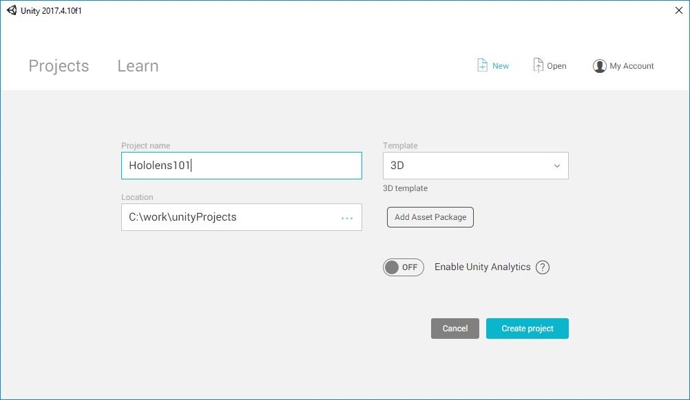 Wenn Visual Studio und Unity installiert sind, erfolgt die Erstellung eines neuen Unity-3D-Projekts. Es müssen keine Project Assets hinzugefügt werden. Außerdem kann Analytics deaktiviert werden.