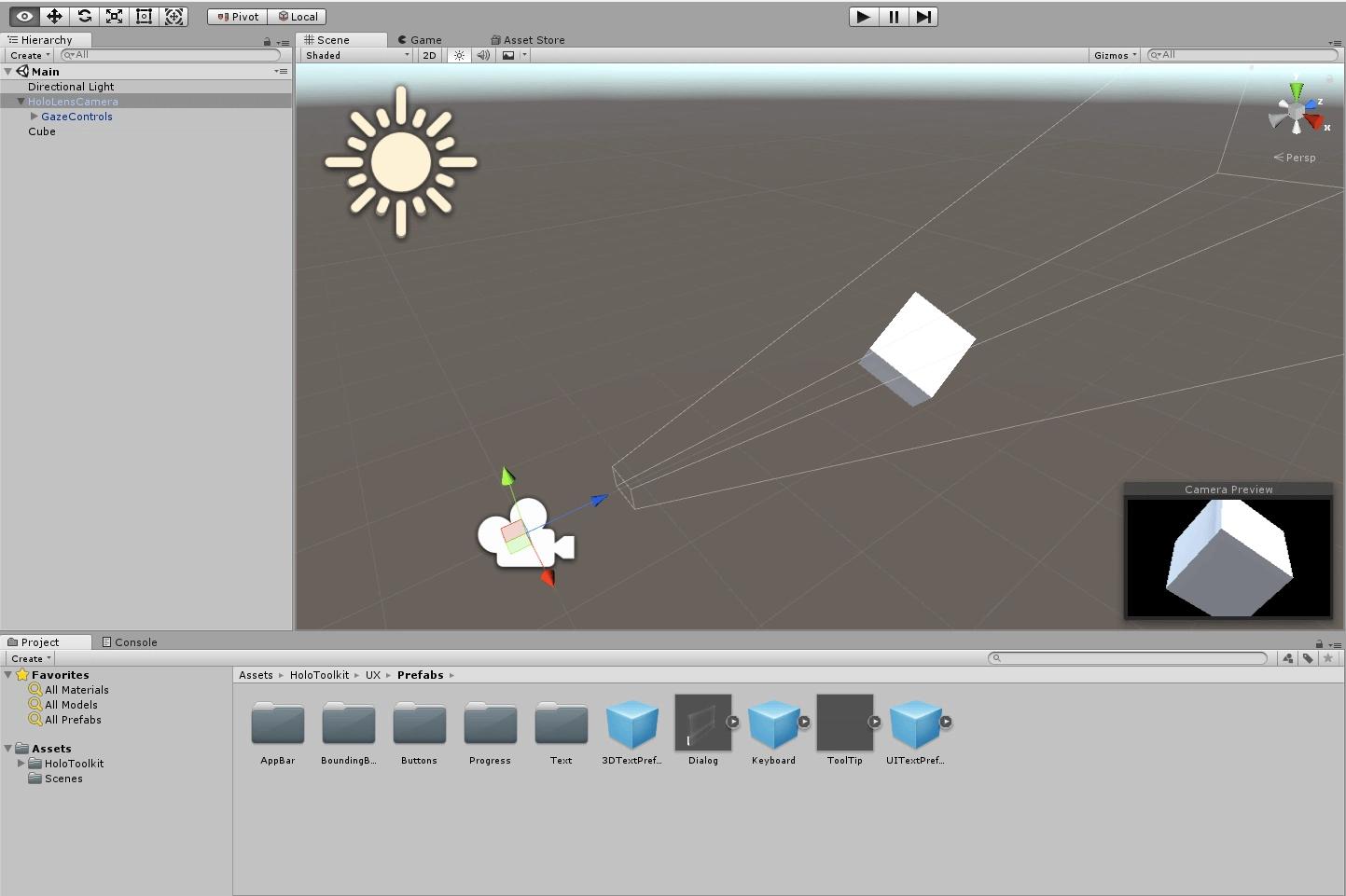Microsoft stellt mit dem HoloToolkit Erweiterungen für Unity zur Verfügung, mit dem man verschiedene Voreinstellungen für die Scene oder das Projekt anwenden kann. Zudem beinhaltet es verschiedene prefabs, mit denen der Einstieg erleichtert werden soll. prefabs sind dabei templates, mit denen 3D-Modelle, Skripte und Einstellungen zusammengefasst werden und so wiederverwendet werden können.
