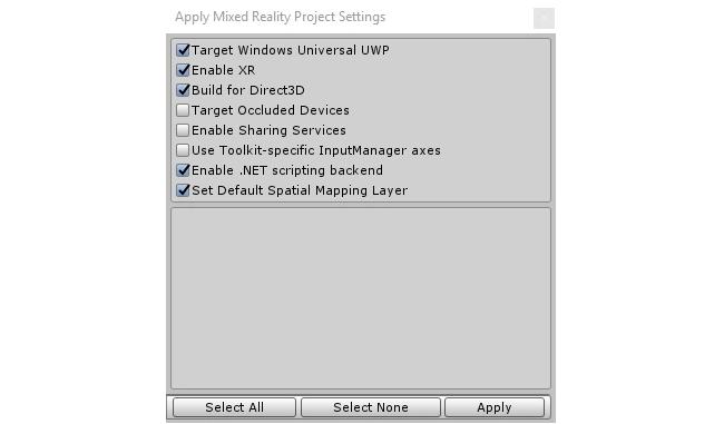 Die Einstellungen, die für die Hololens notwendig sind, können über den Menüpunkt Apply Mixed Reality Project Settings vorgenommen werden. Sämtliche Einstellungen kann man auch manuell in den Build und Player Settings ändern. Die hier gezeigte Funktion soll dem Entwickler ein paar Extraschritte abnehmen und den Setup-Prozess vereinfachen.