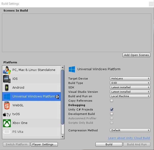 Um die Scene auf der Hololens zu deployen, muss ein Visual-Studio-Projekt erzeugt werden. Dafür öffnet man die Build Settings und ändert die Einstellungen wie im folgenden Bild dargestellt:
