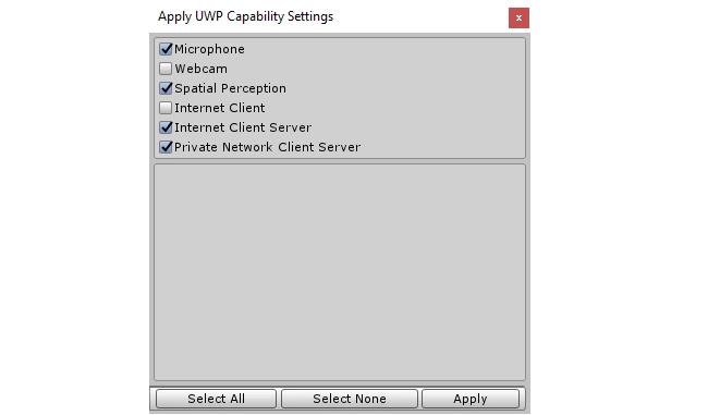 Über den Menüpunkt Apply UWP Capability Settings werden Rechte bzw. der Zugriff auf Resourcen gewährt, welche die Anwendung benötigt. Ohne dieses Menü findet man die Capability Settings in den Player Settings im Bereich der Universal-Windows-Plattform-Einstellungen.